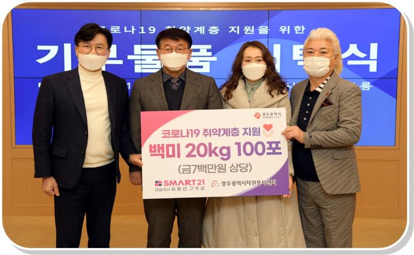À¯ÇÑȸ»ç ½º¸¶Æ®21Àº Äڷγª19·Î ¾î·Á¿ò¿¡ óÇÑ Ãë¾à°èÃþÀ» Áö¿øÇϱâ À§ÇØ ¹é¹Ì 20§¸ 100Æ÷(700¸¸¿ø »ó´ç)¸¦ (»ç)±¤ÁÖ½ÃÀÚ¿øºÀ»ç¼¾ÅÍ¿¡ Àü´ÞÇß´Ù. Àü´ÞµÈ ¹é¹Ì´Â Äڷγª19·Î ¾î·Á¿î °æ¿µ³ ¼Ó¿¡¼µµ ¡®Ãµ¿ø ¹ä»ó¡¯À¸·Î ¼Ò¿Ü ÀÌ¿ôÀÇ ÁöÅ´ÀÌ ¿ªÇÒÀ» Çϰí ÀÖ´Â µ¿±¸ ´ëÀνÃÀå ³» ¡®Çضߴ ½Ä´ç¡¯°ú 5°³ ±¸ ÀÚ¿øºÀ»ç¼¾Å͸¦ ÅëÇØ Ãë¾à°èÃþ¿¡ Àü´ÞµÉ ¿¹Á¤ÀÌ´Ù.