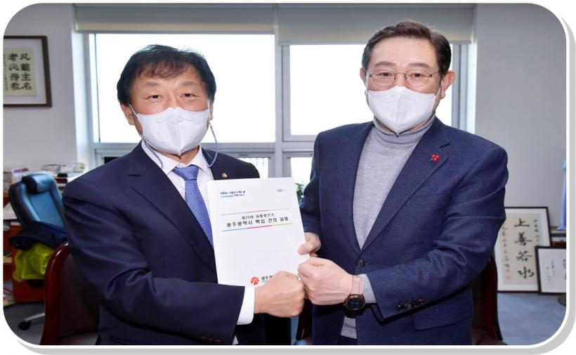 ±¤Áֽô ´ë¼±°ø¾à¿¡ ¹Ý¿µÇØ¾ß ÇÒ ¡®½Ã¹ÎÀÌ ÇູÇÑ ´õ Å©°í ´õ °ÇÑ ¹Ì·¡ ±¤ÁÖ¡¯¸¦ À§ÇÑ °úÁ¦ÀÎ ¡ã±¤ÁÖ¡¤Àü³²ÀÇ »ó»ý°ú µ¿¹Ý¼ºÀåÀ» µµ¸ðÇϱâ À§ÇØ ÀÓ±â Áß ±¤ÁÖ ±º °øÇ× ÀÌÀü ¹®Á¦ ÇØ°á(±¹°¡»ç¾÷È) ¡ã1800¸¸ µ¿¡¤¼ ±¤¿ª °æÁ¦±ÇÀ» ±¸ÃàÇØ Áö¿ª ±ÕÇü¹ßÀüÀ» µµ¸ðÇϱâ À§ÇÑ ±¤ÁÖ-´ë±¸ ´Þºû°í¼Óöµµ Àӱ⠳» Á¶±â Âø°ø(¿¹ºñŸ´ç¼ºÁ¶»ç ¸éÁ¦) ¡ã±¤ÁÖ¿Í ÀÎÁ¢ÇÑ 5°³ ½Ã¡¤±º(³ªÁÖ, ȼø, ´ã¾ç, ÇÔÆò, À强)À» ´ÜÀÏ °æÁ¦±ÇÀ¸·Î ¹¾î ÀΰøÁö´É ±â¹ÝÀÇ ºû°íÀ» ½º¸¶Æ® ¸Þ°¡½ÃƼ·Î Á¶¼º ¡ã¾Æ½Ã¾Æ¹®ÈÁ߽ɵµ½Ã ±¤ÁÖ¸¦ ´ëÇ¥ÇÏ´Â °ø¿¬¿¹¼ú ÀÎÇÁ¶ó È®º¸¸¦ À§ÇÑ ±¤ÁÖ ¾Æ½Ã¾Æ ¾ÆÆ®½ºÄù¾î Á¶¼º µîÀ» ¼³¸íÇϰí ÇùÁ¶¸¦ ¿äûÇß´Ù.