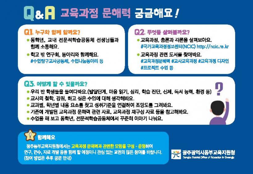 ÀÌ¿¡ ±¤ÁÖµ¿ºÎ±³À°Áö¿øÃ»¿¡¼´Â 2021³â ÇϹݱâºÎÅÍ ±³»ç°¡ ±³À°°úÁ¤ÀÇ Àü¹®¼º°ú ÀÚÀ²¼ºÀ» ¹ßÈÖÇϱâ À§ÇØ ÇÊ¿äÇÑ ¡®±³À°°úÁ¤ ¹®Çط¡¯ Çâ»óÀ» À§ÇÑ ÇöÀåÁö¿ø´ÜÀ» ¿î¿µÇß´Ù. ±¤ÁÖ °ü³» ±³»ç·Î ±¸¼ºµÈ ÇöÀåÁö¿ø´ÜÀº 5ȸ ÀÌ»óÀÇ ÇùÀÇȸ¸¦ ÅëÇØ ±³À°°úÁ¤ ¹®ÇØ·ÂÀÇ Çʿ伺, °³³ä µîÀ» ¿¬±¸Çϰí Á¤¸®ÇØ ¸®Çø´À» Á¦ÀÛÇß´Ù.