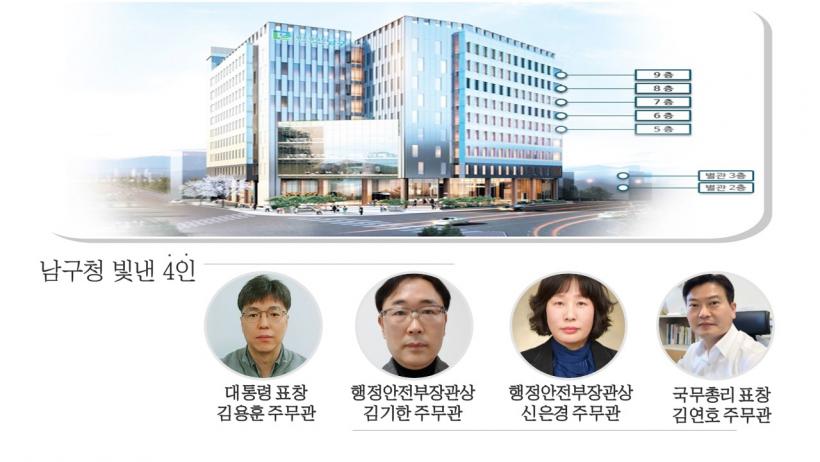 [°ø°£´º½º = ±è¼ö±Ù±âÀÚ] °øÁ÷À» ¼öÇàÇÏ¸é¼ ±¤ÁÖ ³²±¸¸¦ ºû³½ °ø¹«¿ø 4¸íÀÌ Á¤ºÎ¿¡¼ »ÌÀº ¿ì¼ö‧¸ð¹ü °ø¹«¿ø¿¡ ¼±Á¤µÅ ´ëÅë·É ǥâ µî Á¤ºÎ Æ÷»óÀ» ¹Þ¾Ò´Ù.