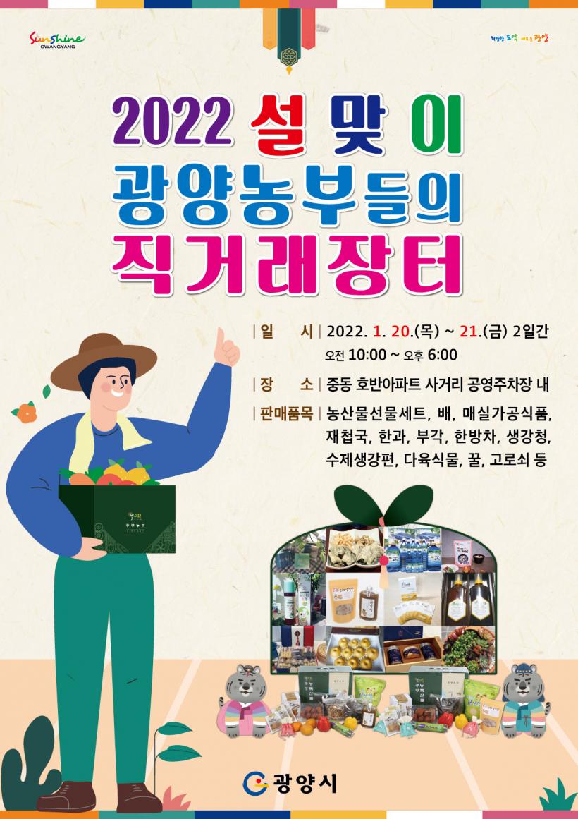 [°ø°£´º½º = ±è´ë¿µ±âÀÚ] ±¤¾ç½Ã´Â 2022³â ¼³¸íÀýÀ» ¸Â¾Æ ¿À´Â 1¿ù 20ÀϺÎÅÍ ÀÌÆ²°£ ±¤¾ç¿¡¼­ »ý»êµÇ´Â ¿ì¼ö ³óƯ»ê¹°À» ¾ÈÀüÇÏ°Ô ±¸ÀÔÇÒ ¼ö ÀÖ´Â ¡®¼³¸ÂÀÌ ±¤¾ç³óºÎµéÀÇ Á÷°Å·¡ÀåÅÍ¡¯¸¦ ¿î¿µÇÑ´Ù.