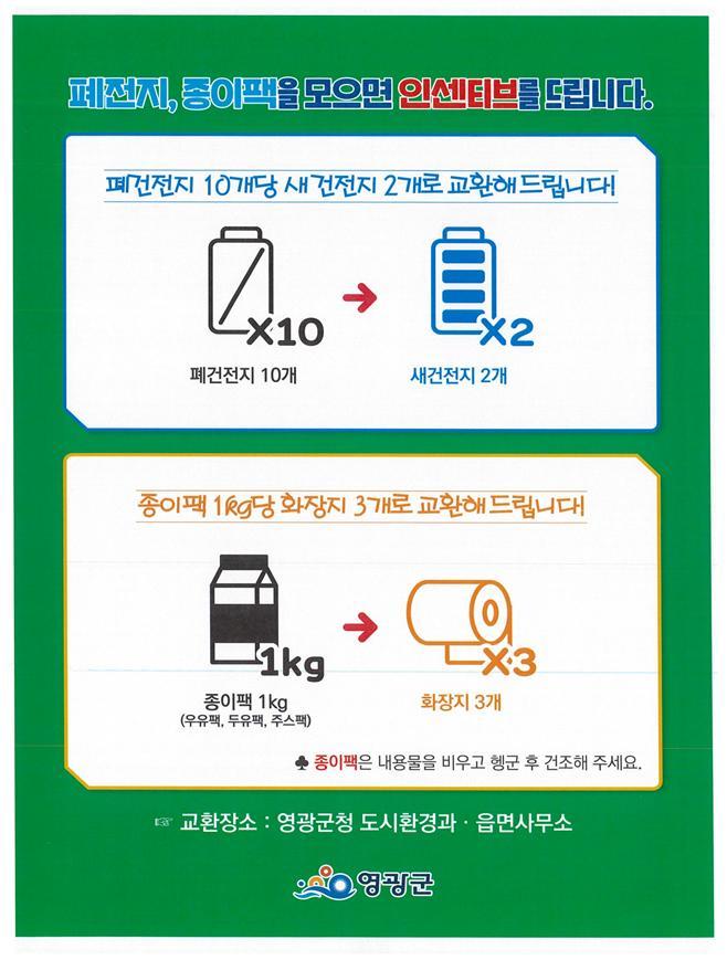 À̹ø »ç¾÷Àº Æó°ÇÀüÁö 10°³¸¦ ¸ðÀ¸¸é »õ ÀüÁö 2°³·Î ±³È¯ÇØÁÖ°í Á¾ÀÌÆÑ(¿ìÀ¯ÆÑ, µÎÀ¯ÆÑ)À» ¸ðÀ¸¸é ÈÀåÁö 3·Ñ·Î ±³È¯ÇØÁÖ´Â »ç¾÷À¸·Î ÀçȰ¿ëǰ ȸ¼ö Ãë¾àǰ¸ñÀÎ ÆóÀüÁö¿Í ¿ìÀ¯ÆÑÀ» º¸´Ù ¿øÈ°È÷ ¼ö°ÅÇϱâ À§ÇÑ ¸ñÀûÀ¸·Î ¿¬Áß ÃßÁøÇÑ´Ù.