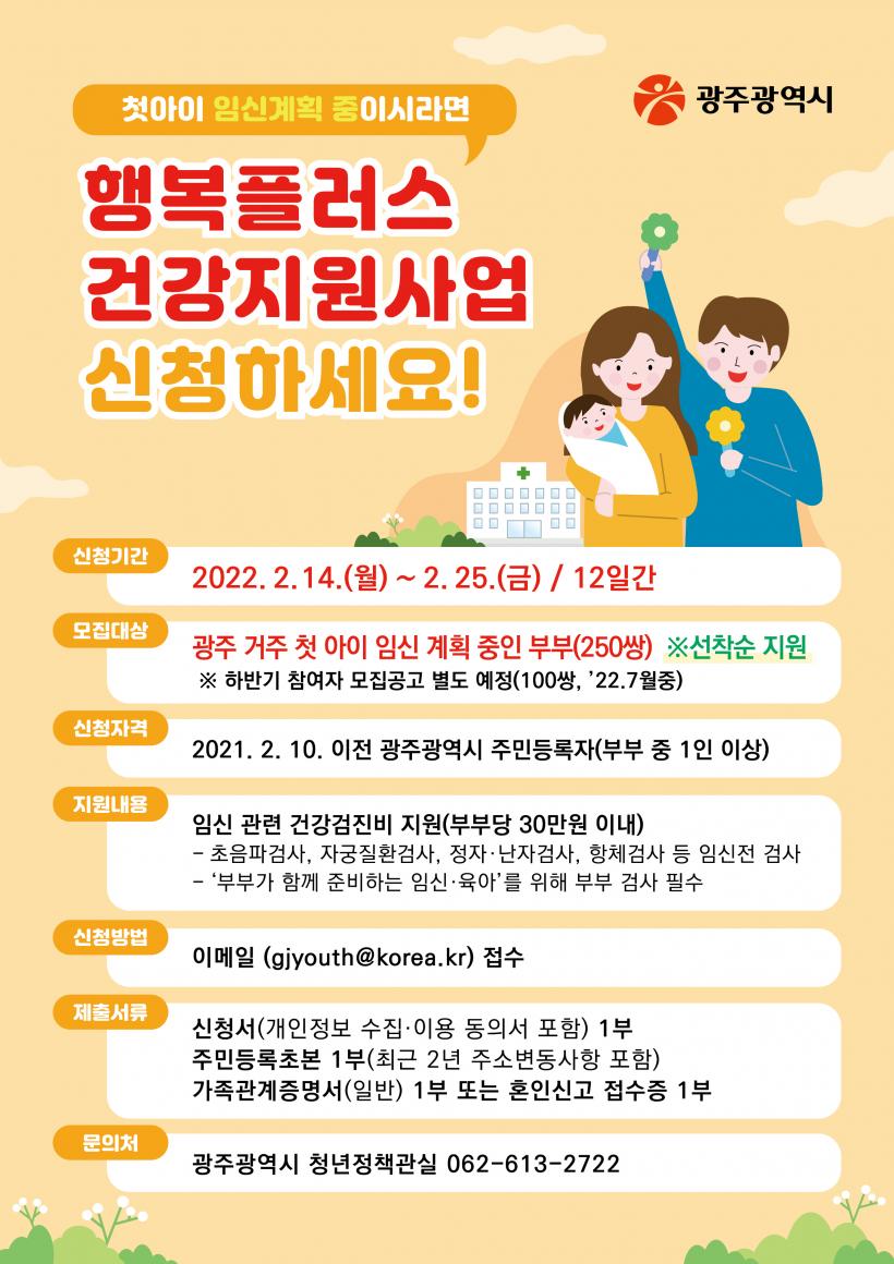 [°ø°£´º½º = ±è¼ö±Ù±âÀÚ] ±¤ÁÖ±¤¿ª½Ã´Â ù ¾ÆÀÌ ÀÓ½ÅÀ» °èȹÇϰí ÀÖ´Â ºÎºÎ¿¡°Ô Àӽаü·Ã °Ç°°ËÁøÀ» Áö¿øÇÏ´Â ¡®2022³â ÇູÇ÷¯½º °Ç°Áö¿ø»ç¾÷¡¯ Âü¿©ÀÚ 250½ÖÀ» ¸ðÁýÇÑ´Ù.
