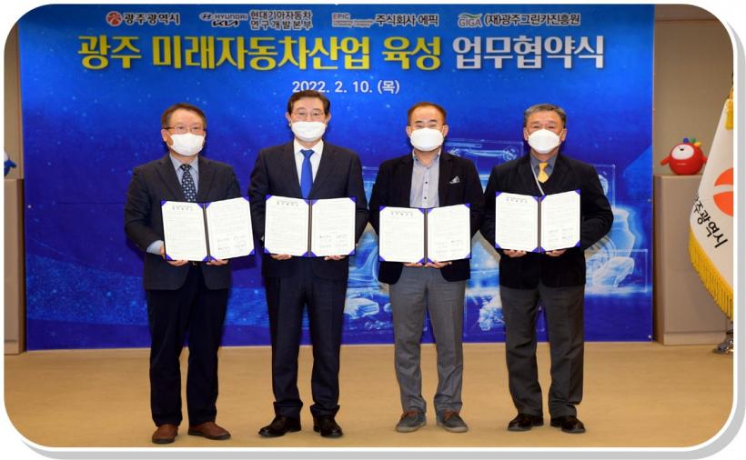 À̿뼷 ±¤ÁÖ±¤¿ª½ÃÀåÀÌ 10ÀÏ ¿ÀÀü ½Ãû ºñÁî´Ï½º·ë¿¡¼ Çö´ë±â¾ÆÂ÷, EPIC, ±¤Áֱ׸°Ä«ÁøÈï¿ø°ú ÇÔ²² ±¤ÁÖ ¹Ì·¡ÀÚµ¿Â÷»ê¾÷ »ýŰè Á¶¼ºÀ» À§ÇÑ ¾÷¹«Çù¾àÀ» ü°áÇÑ ÈÄ ±â³äÃÔ¿µÀ» Çϰí ÀÖ´Ù.(¿ÞÂʺÎÅÍ EPIC ÃÖ¼º½Ä ´ëÇ¥ÀÌ»ç, À̿뼷 ±¤ÁÖ±¤¿ª½ÃÀå, Çö´ë±â¾ÆÂ÷ ¿¬±¸°³¹ßº»ºÎ ±è¿ëÈ Àü¹«, ±¤Áֱ׸°Ä«ÁøÈï¿ø ±è´ö¸ð ¿øÀå)
