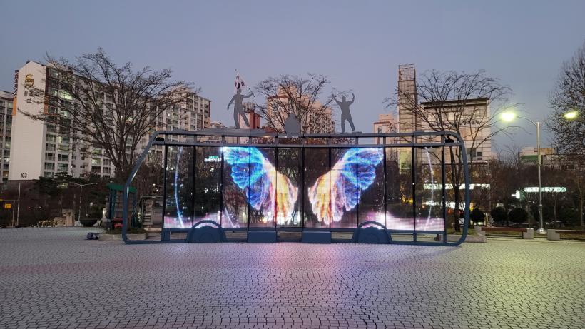 ¸ÕÀú, ¹Ìµð¾î¿ùÀº Æø 10m, ³ôÀÌ 3m ±Ô¸ðÀÇ ¹ÝÅõ¸í À¯¸®·Î Á¦À۵ƴÙ. 5¡¤18±¤ÁÖ¹ÎÁÖȿÀÇ ´ëÇ¥ÀûÀÎ ¿µ»óÀÚ·á Áß ¹ö½º À§ űر⸦ Èçµå´Â ½Ã¹ÎÀÇ ¸ð½ÀÀ» Çü»óÈÇß´Ù.