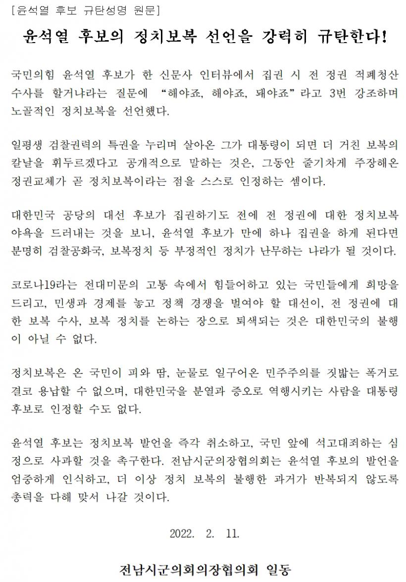 Àü³² 22°³ ½Ã±º ÀÇÀå Àü¿øÀº Áö³ 11ÀÏ ¡°À±¼®¿ Èĺ¸ÀÇ Á¤Ä¡º¸º¹ ¼±¾ðÀ» °·ÂÈ÷ ±ÔźÇÑ´Ù!¡±¸ç ±Ôź¼º¸í¹®À» ¹ßÇ¥Çß´Ù.