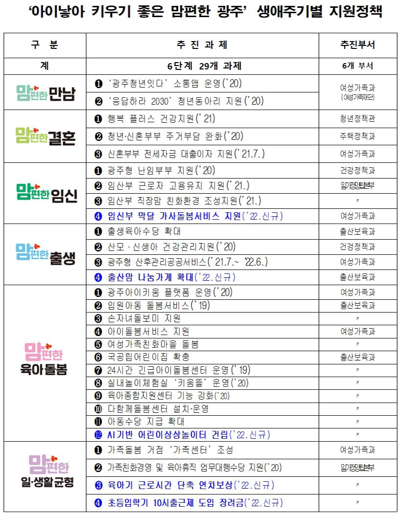 ƯÈ÷, Áö³ÇØ¿¡´Â ±¤ÁÖ¿¡¼ Ãâ»ýÇÑ Ãâ»ý¾Æ¿¡°Ô Ãâ»ýÃàÇϱÝ(100¸¸¿ø)°ú 24°³¿ù±îÁö À°¾Æ¼ö´ç 20¸¸¿ø¾¿ Áö±ÞÇÏ´Â Ãâ»ýÀ°¾Æ¼ö´ç, ÀӽźΠ±Ù·ÎÀÚ °í¿ëÀ¯Áö Áö¿ø ¹× ÀÓ»êºÎ Á÷À帾 Ä£Èȯ°æ Á¶¼ºÁö¿ø »ç¾÷À» Àü±¹ ÃÖÃÊ·Î ½ÃÇàÇß´Ù.