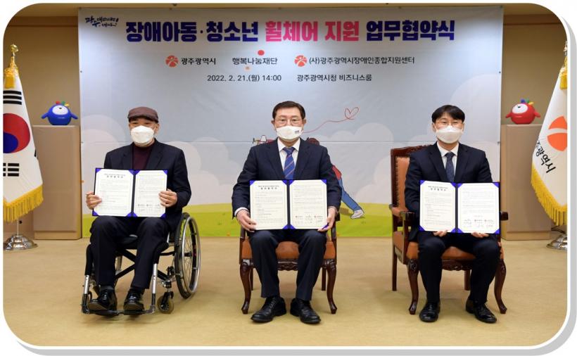À̿뼷 ±¤ÁÖ±¤¿ª½ÃÀåÀÌ 21ÀÏ ¿ÀÈÄ ½Ãû ºñÁî´Ï½º·ë¿¡¼ SK »çȸ°øÇåÀç´ÜÀÎ Çູ³ª´®Àç´Ü ÀÌ»óÇö ¼¼»óÆÄÀÏÆÀÀå°ú Àå¾Ö¾Æµ¿¡¤Ã»¼Ò³â À̵¿±Ç ÁõÁøÀ» À§ÇÑ ÈÙü¾î Áö¿ø ¾÷¹«Çù¾àÀ» ü°áÇÑ ÈÄ ±â³äÃÔ¿µÀ» Çϰí ÀÖ´Ù. (¿ÞÂʺÎÅÍ À¯Çö¼· Àå¾ÖÀÎÁ¾ÇÕÁö¿ø¼¾ÅÍ »óÀÓÀÌ»ç, À̿뼷 ±¤ÁÖ±¤¿ª½ÃÀå, ÀÌ»óÇö SKÇູ³ª´®Àç´Ü ¼¼»óÆÄÀÏÆÀÀå)