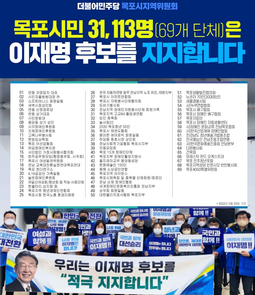 [°ø°£´º½º = ±è¿ëÁø±âÀÚ] ´õºÒ¾î¹ÎÁÖ´ç ¸ñÆ÷½ÃÁö¿ªÀ§¿øÈ¸(À§¿øÀå ±è¿øÀÌ)´Â °¢°è°¢ÃþÀÇ ¸ñÆ÷½Ã¹ÎÀ¸·Î ±¸¼ºµÈ Áö¿ª´Üü µîÀÇ ÀÌÀç¸í Èĺ¸ ÁöÁö¼±¾ðÀÌ À̾îÁ®, ÇöÀç(2¿ù 20ÀÏ ±âÁØ)±îÁö 69°³ ´Üü µî ÃÑ 31,113¸íÀÌ ÁöÁö¼±¾ð¿¡ µ¿ÂüÇß´Ù°í 22ÀÏ ¹àÇû´Ù.