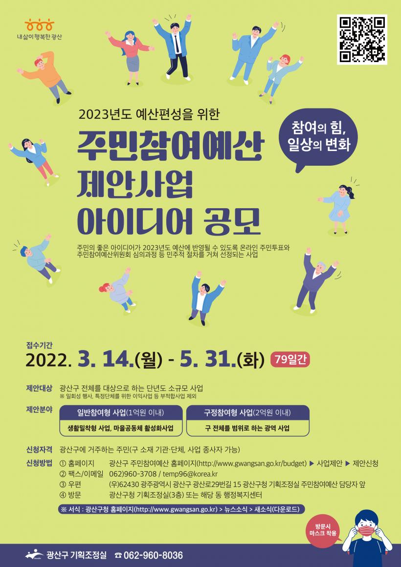 Á¦¾È»ç¾÷ ½Åû¼´Â ±¤»ê±¸ ÁÖ¹ÎÂü¿©¿¹»ê ´©¸®Áý(https://www.gwangsan.go.kr/budget/) ¶Ç´Â µ¿ ÇàÁ¤º¹Áö¼¾ÅÍ, ±¤»ê±¸ ±âȹÁ¶Á¤½Ç ¹æ¹® ȤÀº ¿ìÆí(¿ìÆí¹øÈ£ 62430 ±¤ÁÖ ±¤»ê±¸ ±¤»ê·Î29¹ø±æ 15 ±¤»ê±¸Ã» ±âȹÁ¶Á¤½Ç ÁÖ¹ÎÂü¿©¿¹»ê ´ã´çÀÚ ¾Õ) ¹× ÆÑ½º(062-960-3708)·Î Á¢¼öÇÑ´Ù.
