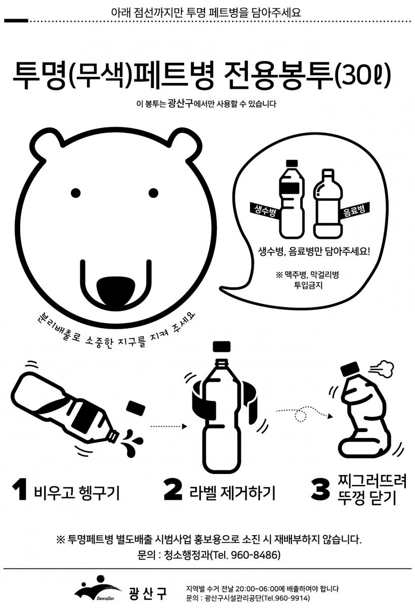 ½Ã¹ÎÀº ¾È³»¹®À» Âü°íÇØ Åõ¸íÆäÆ®º´À» ºÀÅõ¿¡ ¸ð¾Æ ÇØ´ç Áö¿ª ÀçȰ¿ëǰ ¼ö°Å ¿äÀÏ¿¡ ¸ÂÃç ¹èÃâÇÏ¸é µÈ´Ù. ´Ü, ¸ÆÁÖº´, ¸·°É¸®º´ µî À¯»öÆäÆ®º´°ú Æ÷Àå¿ë ÄÅ, Åõ¸í Æ÷Àå¿ë±â µî ÀÏ¹Ý ÇÃ¶ó½ºÆ½Àº ÇÔ²² ´ãÀ¸¸é ¾È µÈ´Ù.