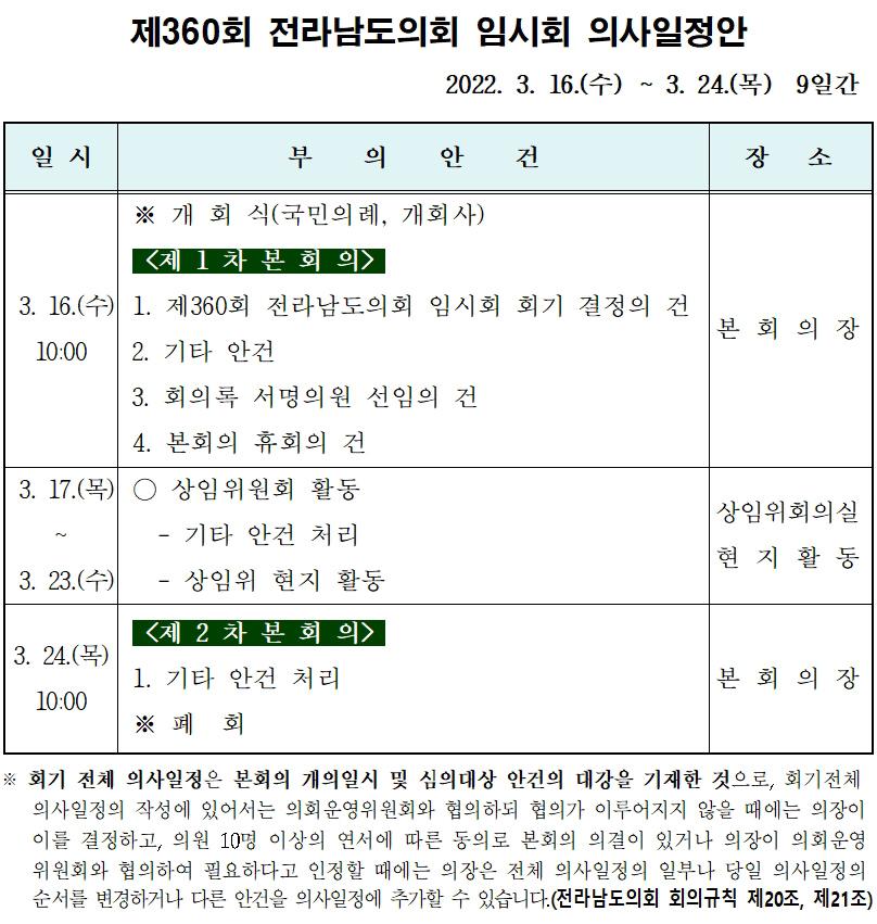 [°ø°£´º½º = ±è¼ö±Ù±âÀÚ] Àü¶ó³²µµÀÇȸ(ÀÇÀå ±èÇÑÁ¾)´Â ¿À´Â 16ÀϺÎÅÍ 24ÀϱîÁö 9Àϰ£ ÀÏÁ¤À¸·Î Á¦360ȸ ÀÓ½Ãȸ¸¦ ¿î¿µÇÑ´Ù.