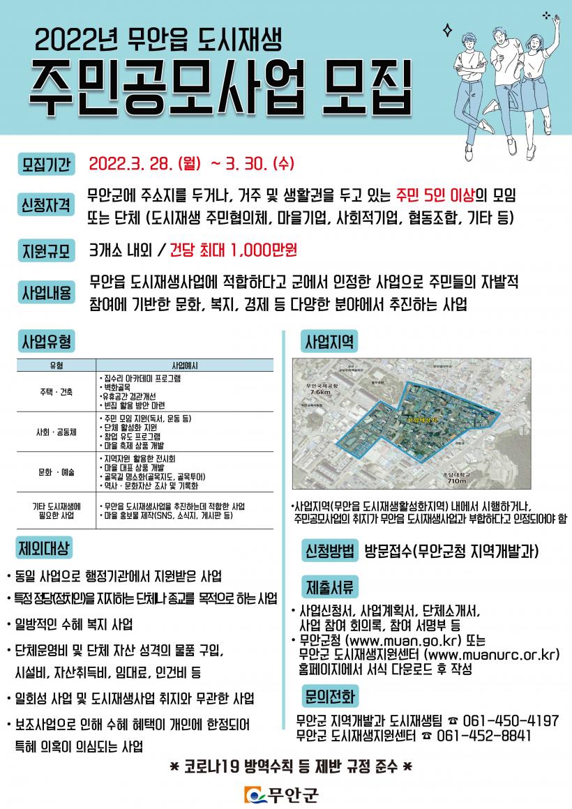 [°ø°£´º½º = ±è¿ëÁø±âÀÚ] ¹«¾È±ºÀº ¹«¾ÈÀ¾ µµ½ÃÀç»ý ´ºµô»ç¾÷ÀÇ ÀÏȯÀ¸·Î °øµ¿Ã¼ Ȱ¼ºÈÀÇ ±â¹ÝÀ» ¸¶·ÃÇϰí ÁÖ¹ÎÁ¶Á÷ÀÇ È°µ¿À» Áö¿øÇÔÀ¸·Î½á µµ½ÃÀç»ý Ȱ¼ºÈ¸¦ µµ¸ðÇϰíÀÚ 2022³â ¹«¾ÈÀ¾ µµ½ÃÀç»ý Áֹΰø¸ð»ç¾÷ ´ë»óÀÚ¸¦ ¸ðÁýÇÑ´Ù°í ¹àÇû´Ù.