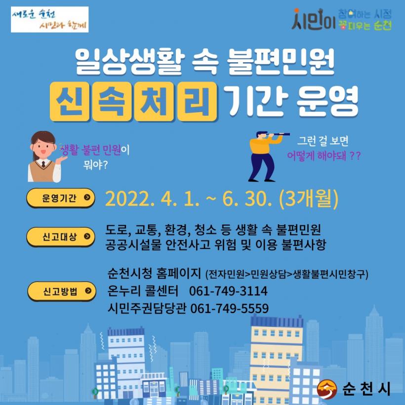 [°ø°£´º½º = ±è´ë¿µ±âÀÚ] ¼øÃµ½Ã(Çã¼® ½ÃÀå)´Â ¿À´Â 4¿ù 1ÀϺÎÅÍ 6¿ù 30ÀϱîÁö 3°³¿ù°£ »ýȰºÒÆí¹Î¿ø ½Å¼Ó 󸮱Ⱓ ¿î¿µ°ú ã¾Æ°¡´Â ÇöÀåÇàÁ¤È°µ¿ °È¸¦ ÃßÁøÇÑ´Ù.