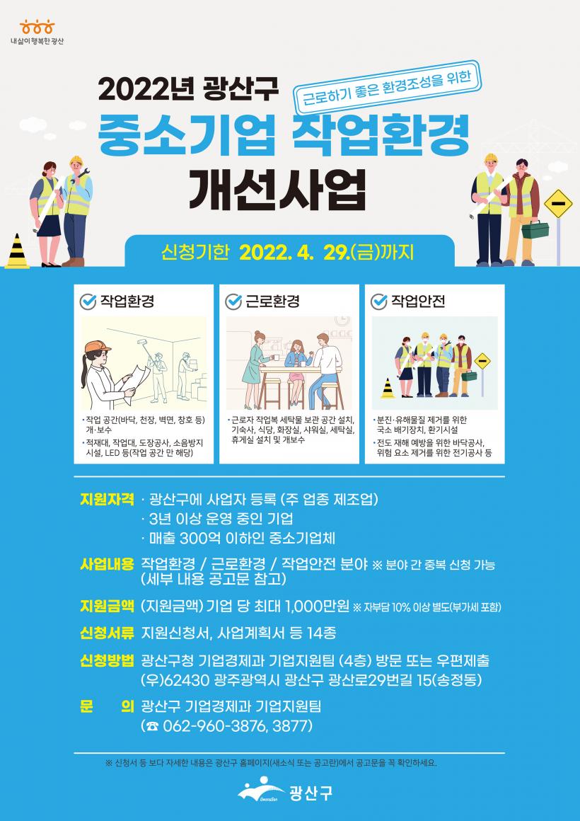 [°ø°£´º½º = ±è´ë¿µ±âÀÚ] ±¤ÁÖ ±¤»ê±¸°¡ ¿À´Â 4¿ù29ÀϱîÁö ¡®2022³â ±¤»ê±¸ Áß¼Ò±â¾÷ÀÛ¾÷ȯ°æ °³¼±»ç¾÷¡¯¿¡ Âü¿©ÇÒ ±â¾÷À» ¸ðÁýÇÑ´Ù.