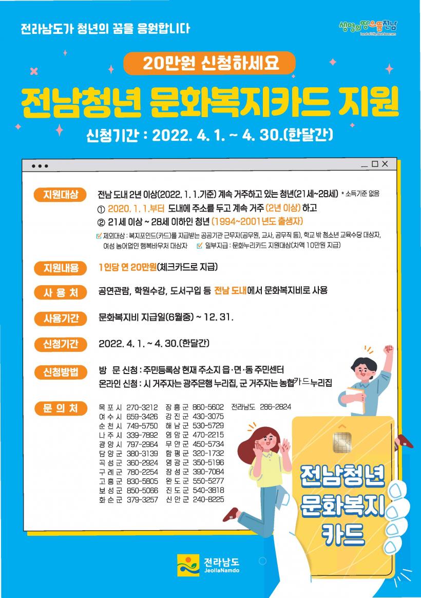 ¿ÃÇØ ÃÖÃÊ·Î ½ÃÇàÇÏ´Â ¡®Àü³² û³â ¹®Èº¹ÁöÄ«µå¡¯ Áö¿ø»ç¾÷Àº û³âÃþ¿¡°Ô ¹®È»ýȰ ÇâÀ¯ ¹× ÀÚ±â°è¹ß ±âȸ¸¦ Á¦°øÇÔÀ¸·Î½á û³âµéÀÇ Áö¿ª Á¤ÂøÀ» À¯µµÇÏ´Â »ç¾÷ÀÌ´Ù.