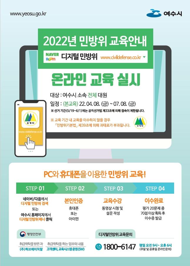 [°ø°£´º½º = ±è´ë¿µ±âÀÚ] ¿©¼ö½Ã°¡ ¿À´Â 4¿ù 8ÀϺÎÅÍ 7¿ù 8ÀϱîÁö ¡®2022³âµµ ¹Î¹æÀ§´ë¿ø »çÀ̹ö±³À°¡¯À» ½Ç½ÃÇÑ´Ù°í 6ÀÏ ¹àÇû´Ù.