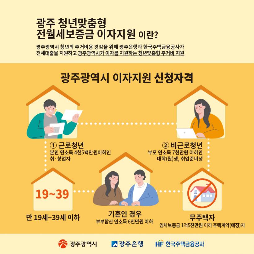 Áö¿ø Á¶°ÇÀº ±¤Áֽÿ¡ ÁÖ¼Ò¸¦ µÐ ¸¸ 19~39¼¼ ¹«ÁÖÅÃÀÚ·Î, ´ëÇÐ(¿ø)»ý¡¤Ãë¾÷Áغñ»ý µî ¹«¼ÒµæÀÚ´Â ºÎ¸ð ¿¬¼Òµæ 7000¸¸¿ø ÀÌÇÏ, ºÎºÎÇÕ»ê 6000¸¸¿ø ÀÌÇÏ¿©¾ß Çϰí, Á÷ÀåÀÎ(»ç¾÷ÀÚ)Àº ¿¬ ¼ÒµæÀÌ º»ÀÎ 4500¸¸¿ø ÀÌÇÏ, ºÎºÎÇÕ»ê 6000¸¸¿ø ÀÌÇÏ¿©¾ß ÇÑ´Ù.