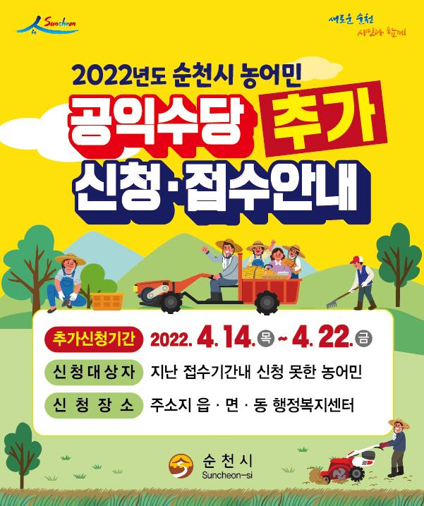[°ø°£´º½º = ±è´ë¿µ±âÀÚ] ¼øÃµ½Ã´Â ±â°£ ³» ¡®2022³â ³ó¾î¹Î °øÀͼö´ç¡¯À» ½ÅûÇÏÁö ¸øÇÑ ³ó¾î¹ÎÀ» ´ë»óÀ¸·Î ¿À´Â 14ÀϺÎÅÍ 22ÀϱîÁö Ãß°¡ Á¢¼öÇÑ´Ù.