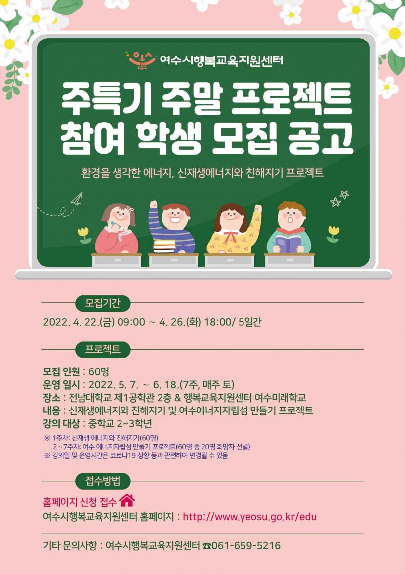 ¸ðÁý ÀοøÀº 60¸íÀ̸ç, Âü°¡¸¦ Èñ¸ÁÇÏ´Â 2,3Çгâ ÁßÇлýÀº 4¿ù 22ÀϺÎÅÍ 26ÀϱîÁö ¿©¼ö½ÃÇູ±³À°Áö¿ø¼¾ÅÍ È¨ÆäÀÌÁö¸¦ ¹æ¹®ÇØ ½ÅûÇÏ¸é µÈ´Ù.