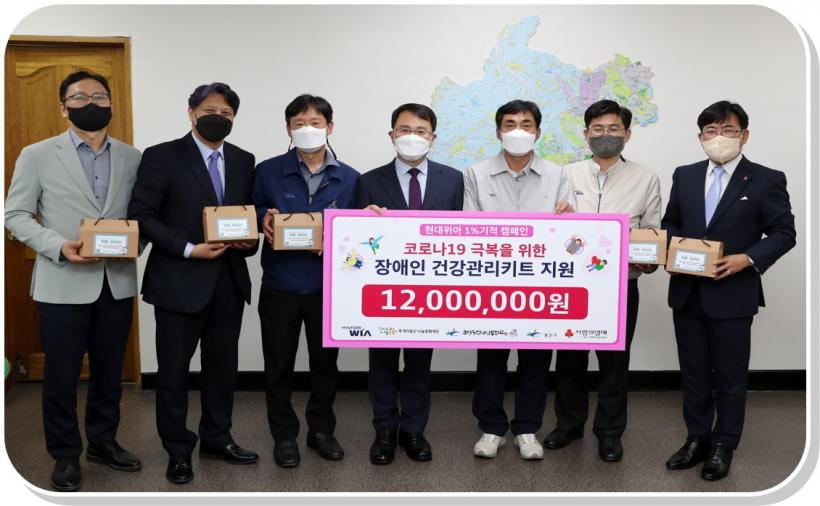 [°ø°£´º½º = ±è´ë¿µ±âÀÚ] Çö´ëÀ§¾Æ(´ëÇ¥ÀÌ»ç Á¤Àç¿í) ÀÓÁ÷¿øµéÀÌ 21ÀÏ ±¤»ê±¸ °ü³» Àå¾ÖÀμ¼´ëÀÇ °Ç°ÁõÁøÀ» À§ÇØ 1200¸¸ ¿ø »ó´çÀÇ ¡®Äڷγª19 ±Øº¹ °Ç°°ü¸®²Ù·¯¹Ì¡¯¸¦ ÈÄ¿øÇß´Ù.
