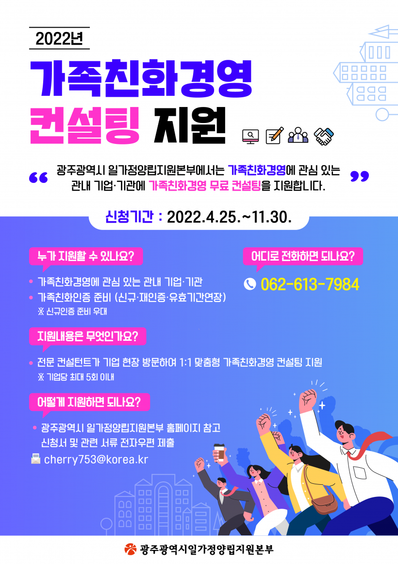 [°ø°£´º½º = ±è¼ö±Ù±âÀÚ] ±¤ÁÖ±¤¿ª½Ã Àϰ¡Á¤¾ç¸³Áö¿øº»ºÎ´Â ¡®¾ÆÀÌ ³º¾Æ Ű¿ì±â ÁÁÀº ¸¾ÆíÇÑ ±¤ÁÖ ÀÏÅÍ ¸¸µé±â¡¯¸¦ Á¶¼ºÇϱâ À§ÇØ 25ÀϺÎÅÍ ¡®°¡Á·Ä£È°æ¿µÄÁ¼³ÆÃ¡¯¿¡ Âü¿©ÇÒ ±â¾÷°ú ±â°üÀ» ¼±Âø¼øÀ¸·Î ¸ðÁýÇÑ´Ù.