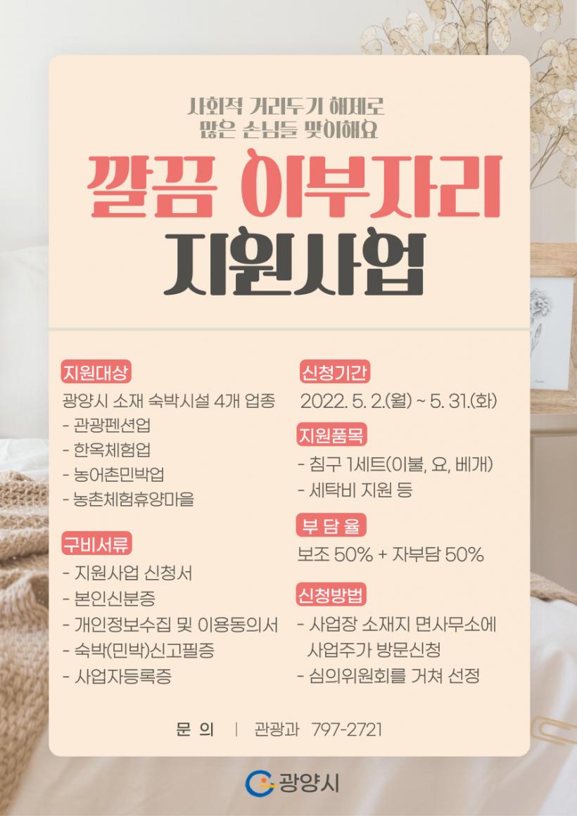 Àü¶ó³²µµ-±¤¾ç½Ã º¸Á¶»ç¾÷À¸·Î ÃßÁøÇÏ´Â ±ò²û À̺ÎÀÚ¸® Áö¿øÀº Áö¿ª ³» ¼÷¹Ú¾÷ü¿¡ ħ±¸·ù¸¦ º¸±ÞÇϰí, Çѹø »ç¿ëÇÑ Ä§±¸·ù´Â À§»ý ¾ÈÀüÀ» À§ÇØ ¼¼Å¹ÇØ »ç¿ëÇϵµ·Ï ¼¼Å¹ºñ¸¦ Áö¿øÇÏ´Â »ç¾÷ÀÌ´Ù.
