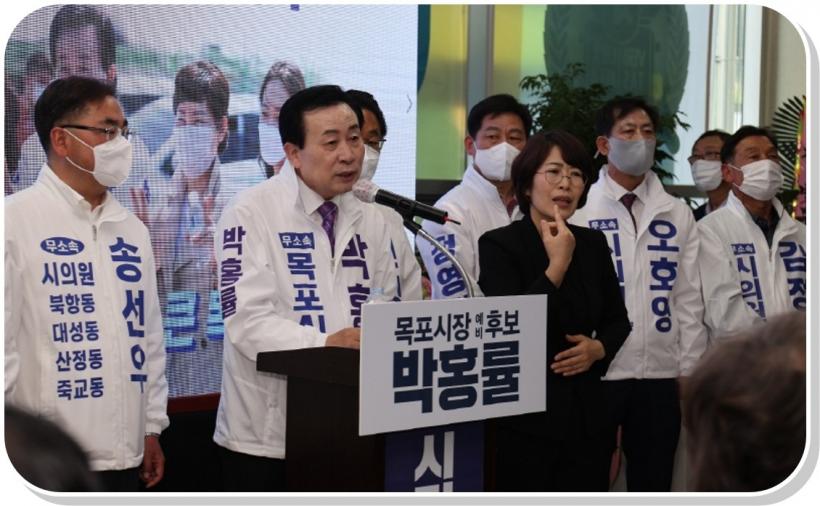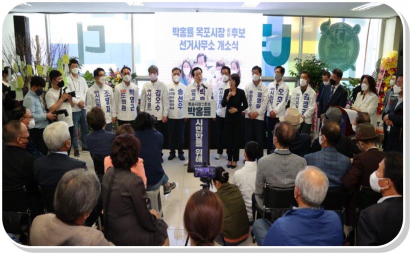 [°ø°£´º½º = ±è¿ëÁø±âÀÚ] ¹ÚÈ«·ü ¸ñÆ÷½ÃÀå ¼±°Å ¿¹ºñÈ帴 ¸ñÆ÷½Ã³» ÇÏ´ç ¹é³â´ë·Î ÁÖº¯¿¡ ¸¶·ÃÇÑ ¼±°Å»ç¹«½Ç¿¡¼ 30ÀÏ °³¼Ò½ÄÀ» ¿°í, ½Ã¹Îµé¿¡°Ô 6¡¤1Áö¹æ¼±°Å¿¡ Ã⸶ ÀÔÀå°ú °¢¿À¸¦ ¹àÇû´Ù.