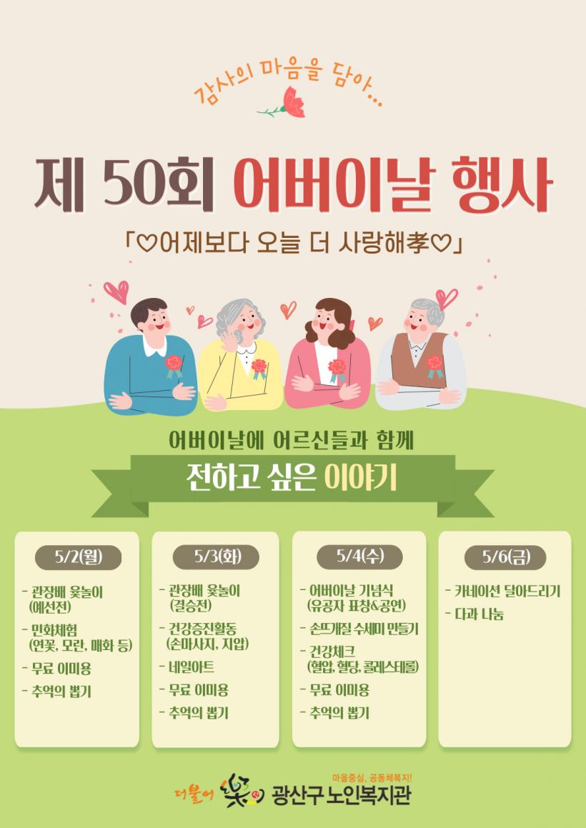 [°ø°£´º½º = ±è´ë¿µ±âÀÚ] Á¦50ȸ ¾î¹öÀ̳¯À» ¸ÂÀÌÇÏ¿© ±¤»ê±¸ ³ëÀκ¹Áö°ü(´õºÒ¾î¶ô, Çູ³ª·ç ³ëÀκ¹Áö°ü)ÀÌ 5¿ù ù° ÁÖ °æ·Îȿģ ÁÖ°£ ±â³äÇà»ç¸¦ °³ÃÖÇÑ´Ù.