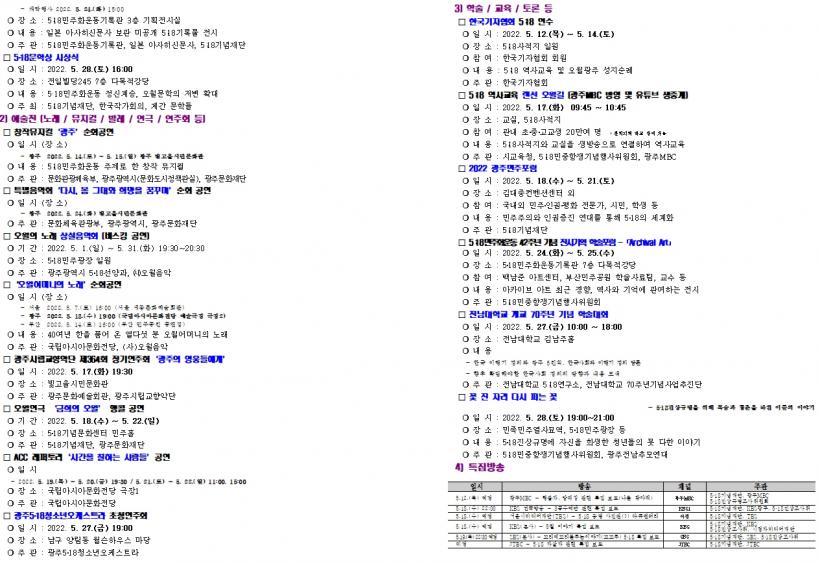 5¡¤18¹ÎÁÖȿ ±×³¯ÀÇ Âü»óÀ» Á÷Á¢ º¼ ¼ö ÀÖ´Â ´Ù¾çÇÑ Àü½Ãȸµµ ¿¸°´Ù. 5¡¤18Èñ»ýÀÚ °¡Á·ÀÇ Æ®¶ó¿ì¸¶¸¦ »çÁøÀ¸·Î ±â·ÏÇÑ ¡®±èÀºÁÖÀÛ°¡ »çÁøÀü¡¯, 5¡¤18°ú ¹ÎÁÖÀÎ±ÇÆòÈÀÇ °¡Ä¡¸¦ ¹ÌÇÐÀûÀ¸·Î ÀçÁ¶¸íÇÑ ¡®±¤ÁÖºñ¿£³¯·¹ º£´Ï½º Ưº°Àü¡¯, 5¡¤18°ü·Ã ³ë·¡¸¦ ¼Ò°³ÇÏ´Â ¡®ÀüÁøÇÏ´Â ¿À¿ù¡¯, 5¡¤18 ¿ª»ç±â·Ï ÀÛǰ°ú âÀÛ¹°À» Àü½ÃÇÏ´Â ¡®È£¸í 5‧18°Å¸®¹Ì¼úÀü¡¯, ÀϺ» ¡®¾Æ»çÈ÷ ½Å¹®»ç ¹Ì°ø°³ 5‧18±â·Ï¹° Ưº°Àü½Ã¡¯ µîÀ» °³ÃÖÇÑ´Ù.