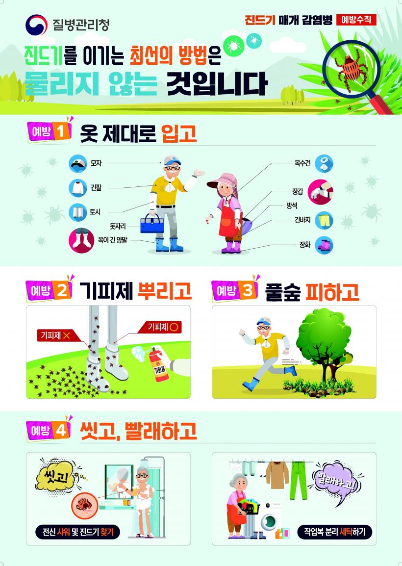 ¿¹¹æ¼öÄ¢À¸·Î´Â ³óÀÛ¾÷ ¹× ¾ß¿ÜȰµ¿ ½Ã Áøµå±â ±âÇÇÁ¦ »ç¿ë°ú ±ä ¼Ò¸Å »óÀÇ¿Í ±ä ¹ÙÁö¸¦ ÀÔ°í, ´Ù¸®¸¦ ¿ÏÀüÈ÷ µ¤´Â ½Å¹ßÀ» Âø¿ëÇØ ÇǺΠ³ëÃâÀ» Â÷´ÜÇϸç, Ç®¹ç À§¿¡ ¿ÊÀ» ¹þ¾îµÎ°Å³ª ´¯Áö ¾Ê±â, ÀÛ¾÷À̳ª Ȱµ¿ ÈÄ ¿ÊÀ» ÅÐ°í ¹Ýµå½Ã ¼¼Å¹Çϱâ, ±Í°¡ ÈÄ ¸ñ¿å µîÀ» ÅëÇØ ¸ö¿¡ Áøµå±â°¡ ºÙ¾îÀÖ´ÂÁö ²Ä²ÄÈ÷ È®ÀÎÇÏ´Â °ÍÀÌ Áß¿äÇÏ´Ù.