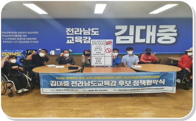 [°ø°£´º½º = ±è¼ö±Ù±âÀÚ] ±è´ëÁß Àü³²µµ±³À°°¨ Èĺ¸¿Í Àü³²±³À°°¨¼±°ÅÀå¾ÖÀο¬´ë´Â Áö³ 20ÀÏ ¿ÀÈÄ ¼øÃµ½Ã ¿¬Ç⵿ ±è´ëÁß Àü³²±³À°°¨ Èĺ¸ ¼±°Å»ç¹«¼Ò¿¡¼ Á¤Ã¥Çù¾à½ÄÀ» °®°í Àå¾ÖÀÎ ±³À°¿¡ »óÈ£ Çù·ÂÇϱâ·Î ´ÙÁüÇß´Ù.