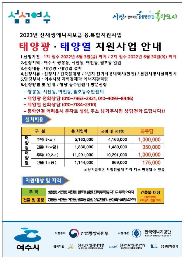 ÇÑÆí, ¿©¼ö½Ã´Â ¡®½ÅÀç»ý¿¡³ÊÁö À¶‧º¹ÇÕÁö¿ø»ç¾÷¡¯ ÄÁ¼Ò½Ã¾ö ÁÖ°ü¾÷ü·Î ¢ß½ÅÈ£¿£Áö´Ï¾î¸µÀ» ¼±Á¤Çϰí, 2021³â¿¡´Â ´ë±³, ±¹µ¿ ±Ç¿ª 327°³¼Ò, 2022³â¿¡´Â ¿©¼, ¹®¼ö, ¹ÌÆò ±Ç¿ª 340°³¼Ò¿¡ ž籤‧ÅÂ¾ç¿ ¼³Ä¡¸¦ Áö¿øÇØ¿À°í ÀÖ´Ù.
