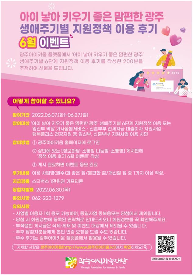 À̹ø À̺¥Æ®´Â ¡®¾ÆÀ̳º¾Æ Ű¿ì±â ÁÁÀº ¸¾ÆíÇÑ ±¤ÁÖ¡¯ »ý¾ÖÁֱ⺰ Áö¿øÁ¤Ã¥À» ÀÌ¿ëÇÑ ½Ã¹ÎÀ» ´ë»óÀ¸·Î »ç¾÷ ³»¿ëÀ̳ª ¼ºñ½ºÀÇ ÁÁÀº Á¡, ºÒÆíÇÑ Á¡, °³¼±ÇÒ Á¡ µîÀÇ ÀǰßÀ» ¼ö·ÅÇϱâ À§ÇØ ¸¶·ÃµÆ´Ù.