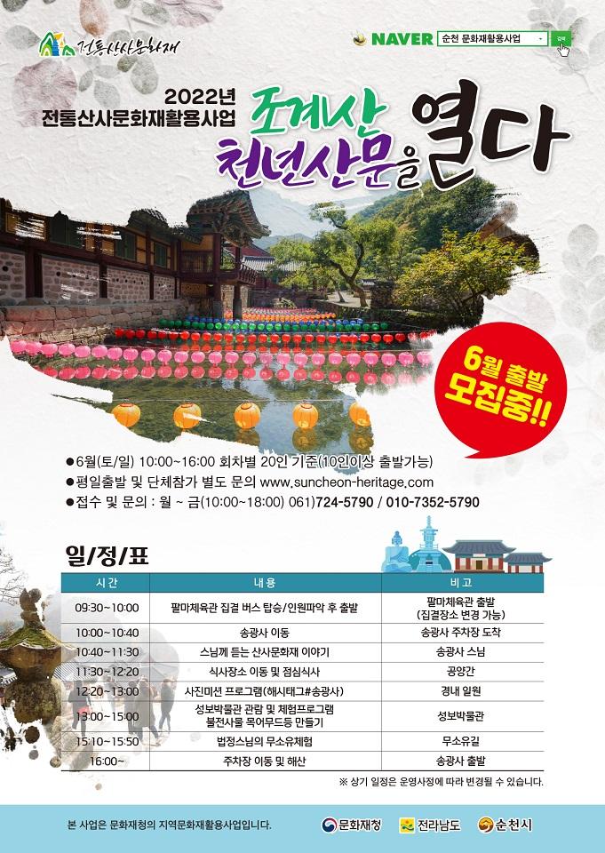 ¼øÃµ½Ã ¹®ÈÀç Ȱ¿ë»ç¾÷¿¡ ´ëÇÑ º¸´Ù ÀÚ¼¼ÇÑ »çÇ× È®ÀÎ ¹× ÇÁ·Î±×·¥ Âü°¡ ½ÅûÀº °ü·Ã ´©¸®Áý(https://www.suncheon-heritage.com)À» ÅëÇØ ÇÒ ¼ö ÀÖ´Ù.