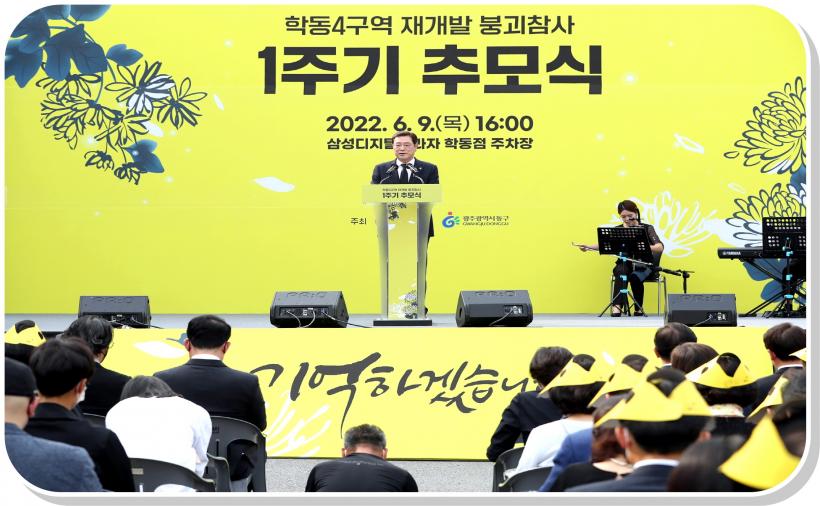 [°ø°£´º½º = ±è¼ö±Ù±âÀÚ] ±¤ÁÖ±¤¿ª½Ã¿Í µ¿±¸´Â 9ÀÏ Çе¿4±¸¿ª Àç°³¹ß ºØ±«Âü»ç ÇöÀå¿¡¼ À¯°¡Á·µéÀÌ Âü¼®ÇÑ °¡¿îµ¥ ¿µ·ÉÀÇ ³ÌÀ» À§·ÎÇÏ°í ¾ÈÀüÀǽÄÀ» °íÃëÇϱâ À§ÇØ 1ÁÖ±â Ã߸ð½ÄÀ» °³ÃÖÇß´Ù.