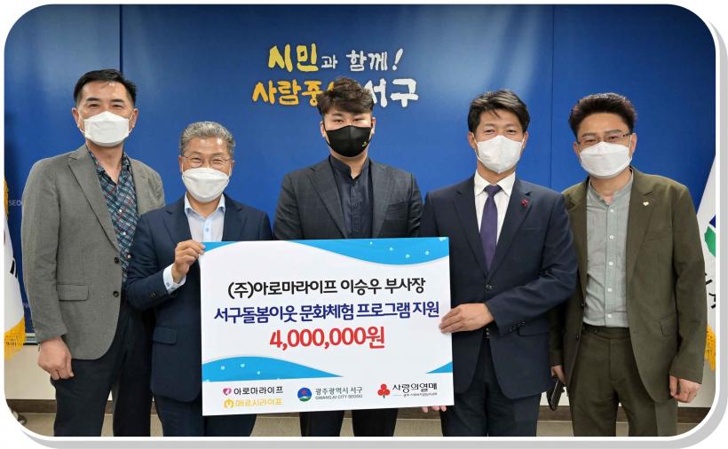 À̳¯ Àü´Þ½Ä¿¡´Â ¢ß¾Æ·Î¸¶¶óÀÌÇÁ ÀÌ½Â¿ì ºÎ»çÀå°ú ±èÁø°ï ±¤ÁÖ»çȸº¹Áö°øµ¿¸ð±Ýȸ »ç¹«Ã³ÀåÀÌ Âü¼®ÇßÀ¸¸ç, ¢ß¾Æ·Î¸¶¶óÀÌÇÁ ÃøÀº Áö¿ª µ¹º½ ÀÌ¿ôµé¿¡°Ô ¿¬±Ø °ü¶÷ µî ¹®ÈüÇèÀÇ ±âȸ¸¦ Á¦°øÇϱâ À§ÇØ 400¸¸¿øÀÇ ¼º±ÝÀ» ¼±¸Áö¿ª»çȸº¸ÀåÇùÀÇü¿¡ ±âŹÇß´Ù.