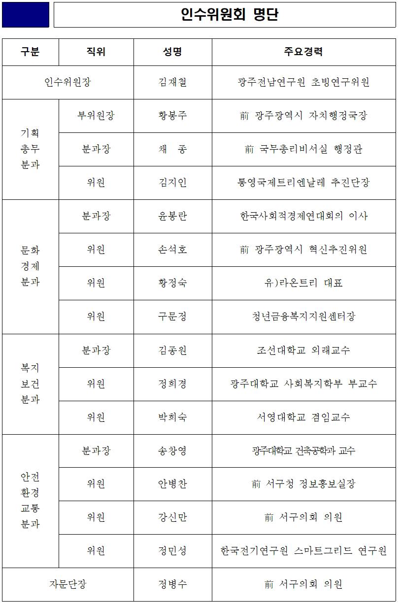 ÀμöÀ§¿øÀåÀº ±èÀçö ±¤ÁÖÀü³²¿¬±¸¿ø Ãʺù¿¬±¸À§¿øÀÌ ÀÓ¸íµÆ´Ù. 30¿© ³â°£ ±¤ÁÖ‧Àü³² ¹ßÀüÀÇ ¹Ø±×¸²À» ±×·Á³»´Âµ¥ ÀÏÀÍÀ» ´ã´çÇÑ Àü¹®°¡·Î ¹Î¼±6±â ±¤ÁÖ±¤¿ª½Ã Âü¿©Çõ½Å´ÜÀåÀ¸·Î Ȱµ¿Çß´Ù.