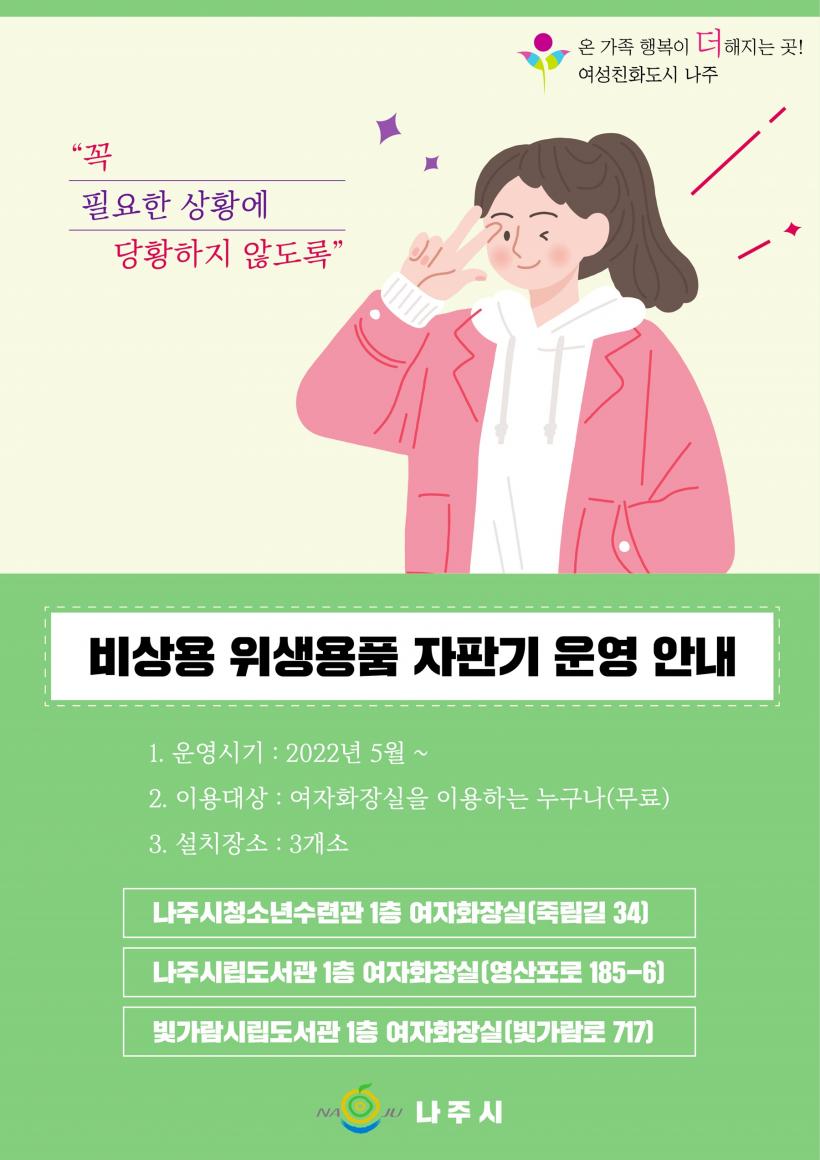 [°ø°£´º½º = ±è¼ö±Ù±âÀÚ] Àü¶ó³²µµ ³ªÁֽô ¿©¼ºÀÇ °Ç°±Ç ÁõÁø°ú ÀÏ»ó»ýȰ ºÒÆí °³¼±À» À§ÇØ °ø°ø½Ã¼³ 3°³¼Ò¿¡ ¡®ºñ»ó¿ë À§»ý¿ëǰ ÀÚÆÇ±â¡¯¸¦ ¿î¿µÇϰí ÀÖ´Ù°í 14ÀÏ ¹àÇû´Ù.