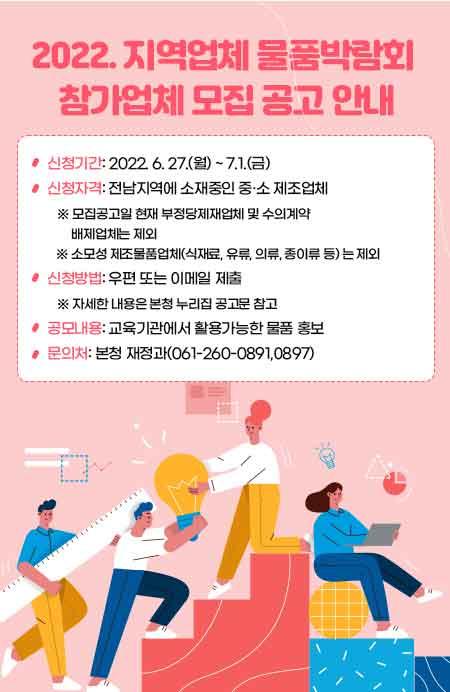 [°ø°£´º½º = ±è¼ö±Ù±âÀÚ] Àü¶ó³²µµ±³À°Ã»ÀÌ Áö¿ª°æÁ¦ Ȱ¼ºÈ¸¦ À§ÇØ ¡®2022. Áö¿ª¾÷ü ¹°Ç°¹Ú¶÷ȸ¡¯¸¦ °³ÃÖŰ·Î Çϰí Âü°¡¾÷ü¸¦ 6¿ù 27ÀÏ(¿ù)ºÎÅÍ 7¿ù 1ÀÏ(±Ý)±îÁö ¸ðÁýÇÑ´Ù.