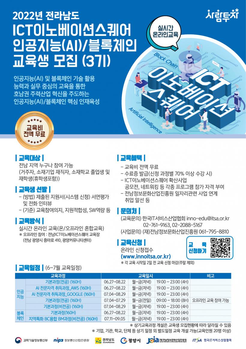 [°ø°£´º½º = ±è´ë¿µ±âÀÚ] ±¤¾ç½Ã´Â Àü³² Áö¿ª ÀΰøÁö´É(AI)°ú ºí·ÏüÀÎ SW ÀÎÀ縦 ¾ç¼ºÇÏ´Â 2022³â Àü³²ICTÀ̳뺣À̼ǽºÄù¾î 3±â ±³À°»ýÀ» ¸ðÁýÇÑ´Ù°í ¹àÇû´Ù.