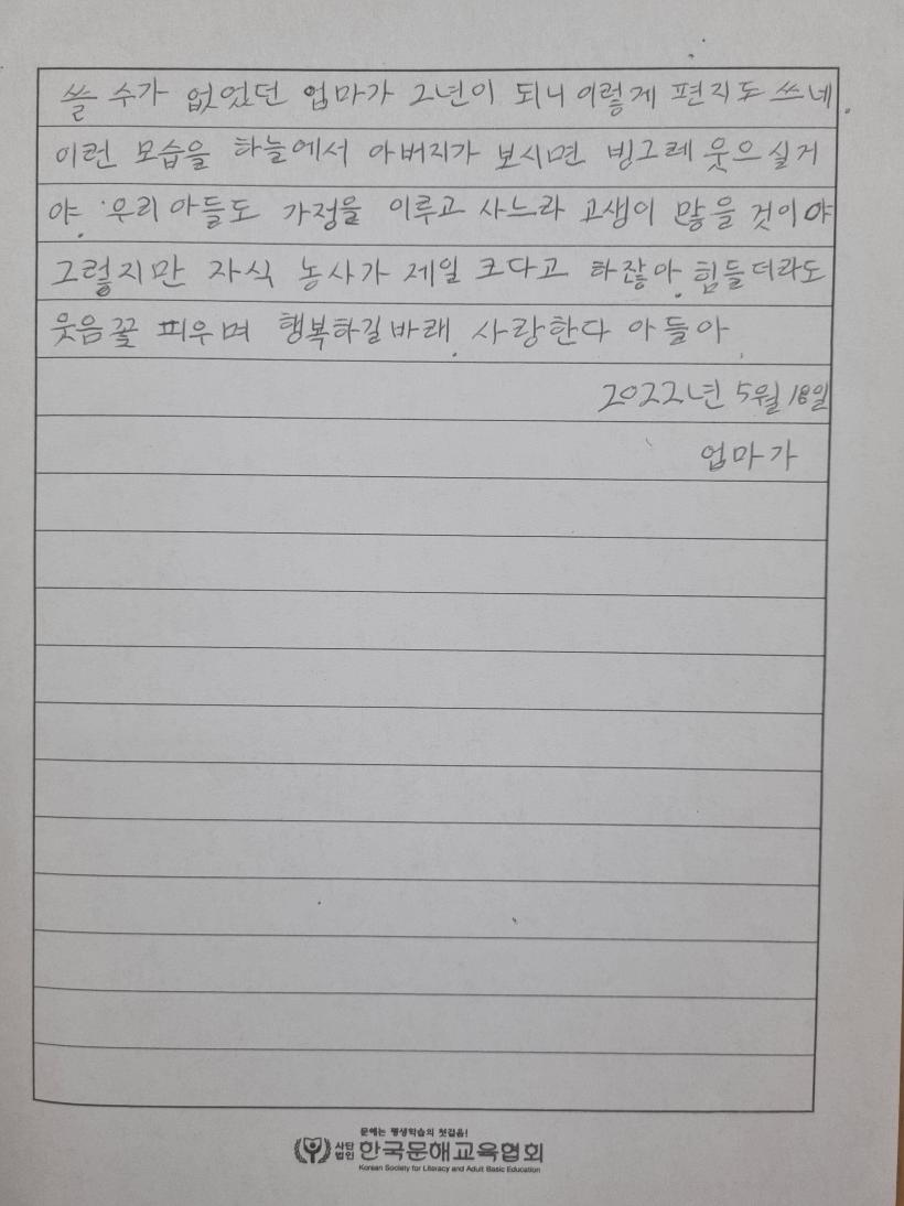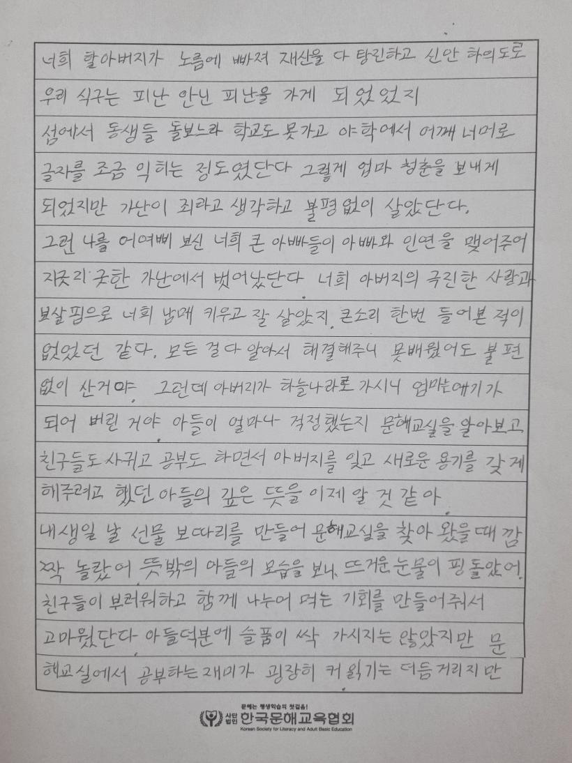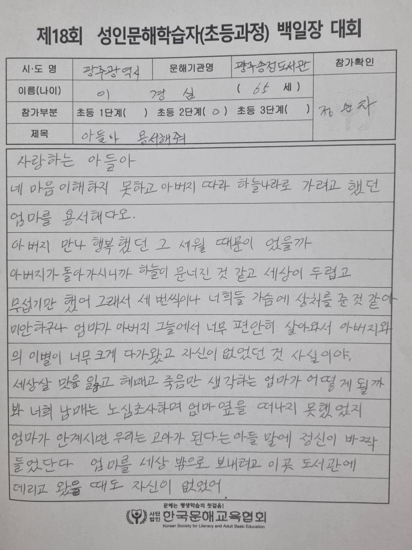 ƯÈ÷ ¿ì¼ö»óÀ» ¼ö»óÇÑ À̰æ½É(ÃʵîÇзÂÀÎÁ¤ ¼ºÀα³À° 2´Ü°è) ¾î¸£½ÅÀº »çº° ÈÄ Èûµé¾îÇÏ´Â ¾ö¸¶°¡ »õ·Î¿î ¿ë±â¸¦ °¡Áú ¼ö ÀÖ°Ô ¹®Çر³½Ç¿¡ Âü¿©Çϵµ·Ï µµ¿ÍÁØ ¾Æµé¿¡ ´ëÇÑ °í¸¶¿ò°ú ¹Ì¾ÈÇÔÀ» ´ã¾Æ ÆíÁö·Î Ç¥ÇöÇß´Ù.