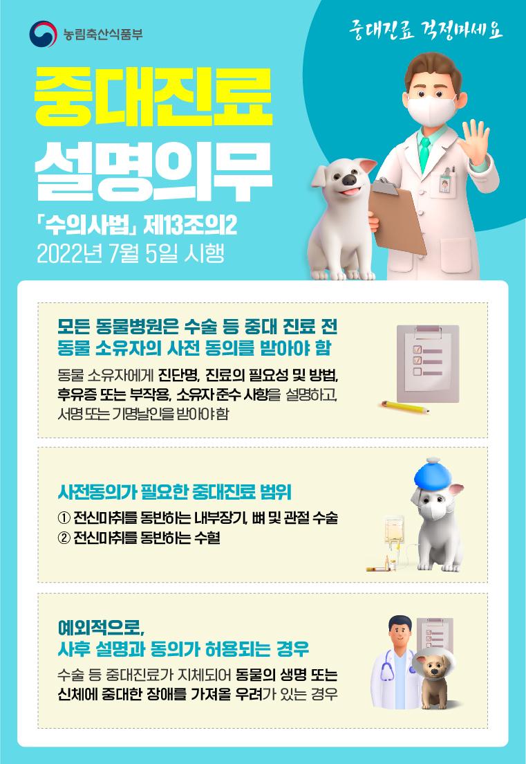 ¼³¸í ¹× µ¿ÀÇ Àǹ«°¡ Àû¿ëµÇ´Â Áß´ëÁø·á ¹üÀ§´Â Àü½Å¸¶Ã븦 µ¿¹ÝÇÏ´Â ³»ºÎÀå±â¡¤»À¡¤°üÀý ¼ö¼ú°ú ¼öÇ÷À̸ç, À̸¦ À§¹ÝÇÒ °æ¿ì¿¡´Â 1Â÷ 30¸¸¿ø, 2Â÷ 60¸¸¿ø, 3Â÷ 90¸¸¿øÀÇ °úÅ·ᰡ ºÎ°úµÈ´Ù. ´Ù¸¸, Áß´ë Áø·á°¡ ÁöüµÇ¸é µ¿¹°ÀÇ »ý¸í¿¡ À§ÇèÀÌ Àְųª Àå¾Ö¸¦ °¡Á®¿Ã ¿ì·Á°¡ ÀÖ´Â °æ¿ì¿¡´Â ¼ö¼ú µî Áß´ëÁø·á ÀÌÈÄ¿¡ ¼³¸íÇÏ°í µ¿ÀǸ¦ ¹ÞÀ» ¼ö ÀÖ´Ù.