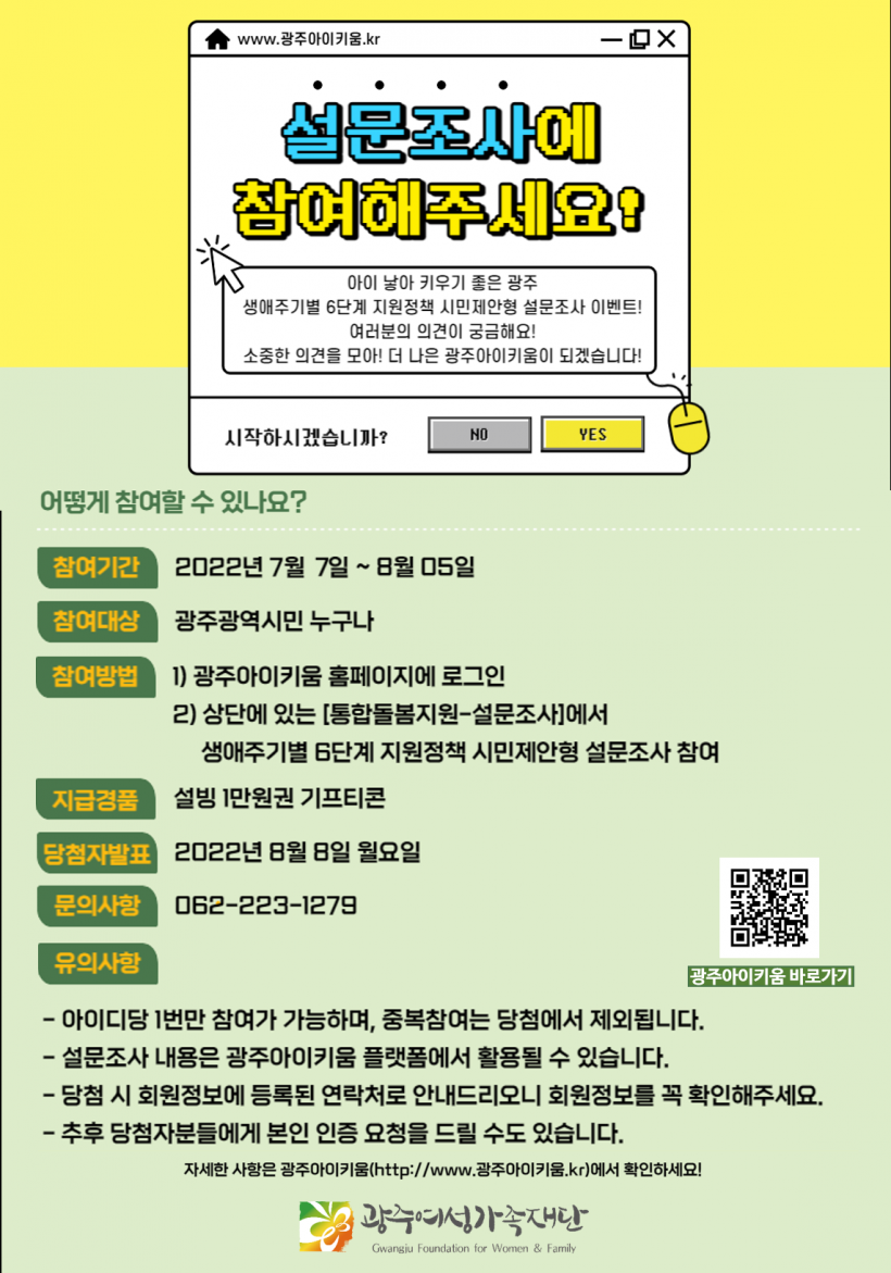 ¼³¹® Âü¿©´Â ±¤ÁÖ¾ÆÀÌŰ¿ò ȨÆäÀÌÁö ÆË¾÷âÀ̳ª »ó´Ü ÅëÇÕµ¹º½Áö¿ø-¼³¹®Á¶»ç °Ô½ÃÆÇ¿¡ ÀÛ¼ºÇÏ¸é µÈ´Ù. ÀÚ¼¼ÇÑ ³»¿ëÀº Ű¿òÁö¿ø´Ü(062-222-1279)À¸·Î ¹®ÀÇÇÏ¸é µÈ´Ù.