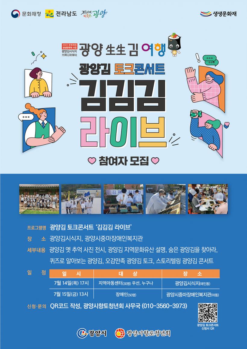 ÇÑÆí, ù ÇÁ·Î±×·¥ÀÎ ¡®±¤¾ç±è ÅäÅ©ÄܼƮ ¡®±è±è±è ¶óÀ̺ꡯ¡¯´Â ¿À´Â 14~15ÀÏ °³ÃÖÇϸç, Âü¿©¹æ¹ýÀº Æ÷½ºÅÍ ¾Æ·¡ QRÄÚµå Á¢¼ö¿Í ÀüÈÁ¢¼ö·Î ÀÌ·ïÁö°í, ÀÚ¼¼ÇÑ »çÇ×Àº ±¤¾ç½Ã ÇâÅäû³âȸ »ç¹«±¹À¸·Î ¹®ÀÇÇÏ¸é µÈ´Ù.