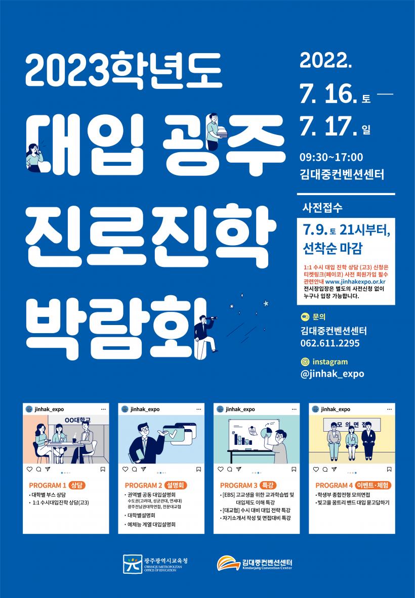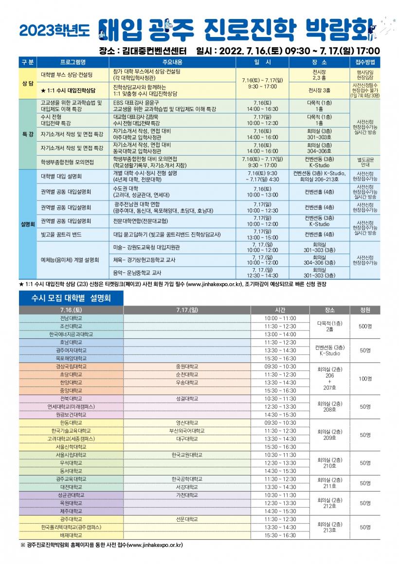 ¼öµµ±Ç ´ëÇÐ, ±¤ÁÖÀü³²Áö¿ª´ëÇÐ, Àü¹®´ëÇÐ °øµ¿ ´ëÀÔ¼³¸íȸ¿Í °¢ ´ëÇк° ¼³¸íȸ, À½¾Ç・¹Ì¼ú・üÀ°°è¿ ¼³¸íȸµµ µ¿½Ã¿¡ °³ÃÖÇÑ´Ù. Áø·Î・ÁøÇлó´ã ¿Â¶óÀÎ ¹êµå¿Í ¿¬°èÇØ ½Ç½Ã°£À¸·Î ´ëÀÔ °ü·Ã ¹¯°í ´äÇϱâ Çà»çµµ À̾îÁø´Ù.