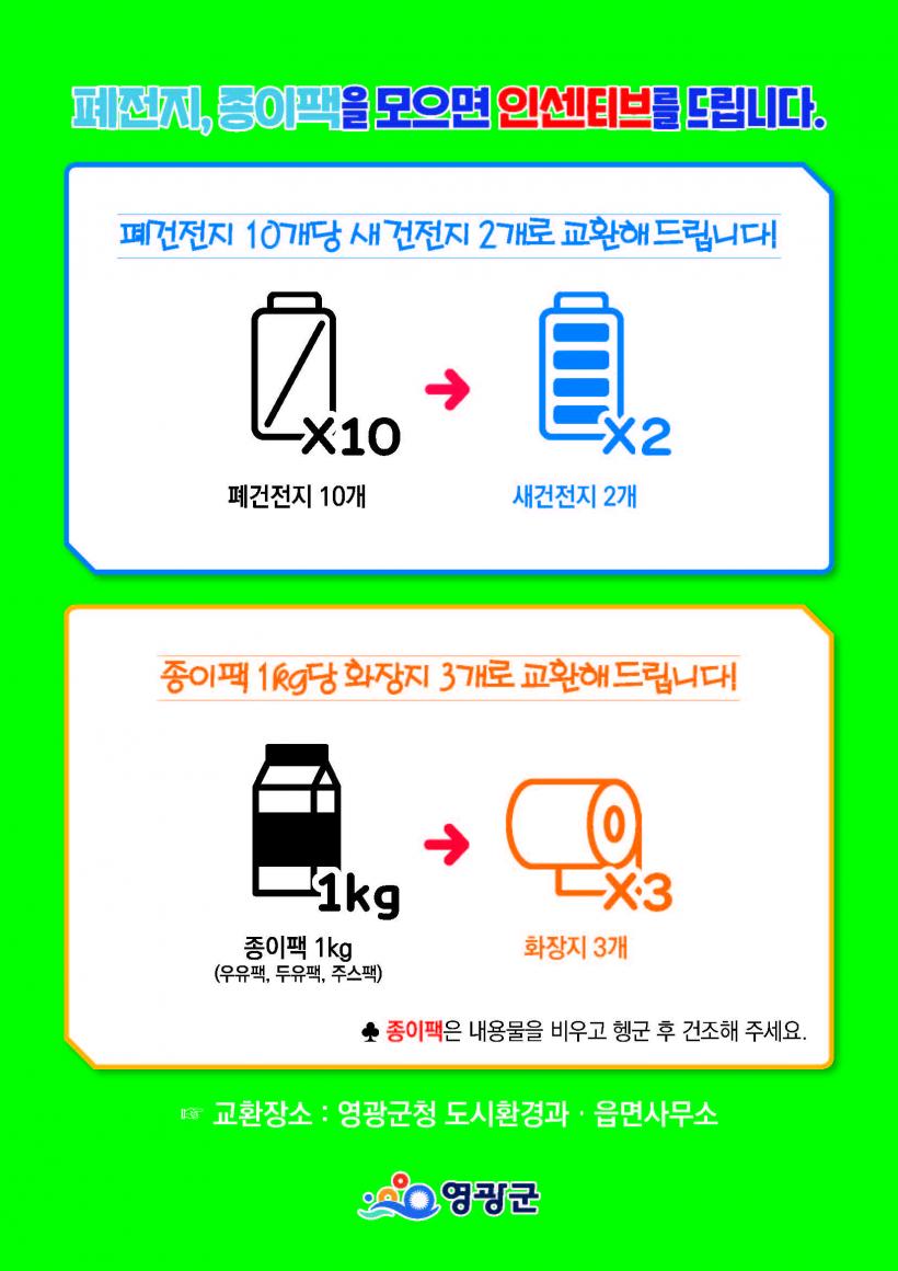 Æó°ÇÀüÁö 10°³¸¦ ¸ðÀ¸¸é »õ ÀüÁö 2°³·Î ±³È¯ÇØÁÖ°í Á¾ÀÌÆÑ(¿ìÀ¯ÆÑ, µÎÀ¯ÆÑ)À» ¸ðÀ¸¸é ÈÀåÁö 3·Ñ·Î ±³È¯ÇØÁÖ´Â »ç¾÷À¸·Î ÀçȰ¿ëǰ ȸ¼ö Ãë¾àǰ¸ñÀÎ ÆóÀüÁö¿Í ¿ìÀ¯ÆÑÀ» º¸´Ù ¿øÈ°È÷ ¼ö°ÅÇϱâ À§ÇÑ ¸ñÀûÀ¸·Î ÃßÁøÇÑ´Ù.