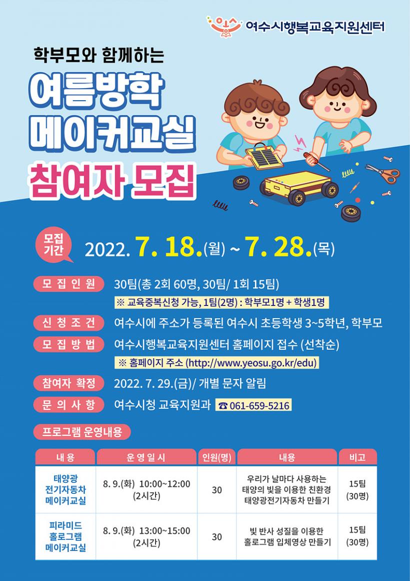 8¿ù 9ÀÏ ¿ÀÀü°ú ¿ÀÈÄ·Î ³ª´² ¿©¼ö½ÃÇູ±³À°Áö¿ø¼¾ÅÍ¿¡¼ ¡®Å¾籤 Àü±âÀÚµ¿Â÷¡¯, ¡®È¦·Î±×·¥ ÇǶó¹Ìµå¡¯ ¸¸µé±â·Î ÁøÇàµÉ ¿¹Á¤ÀÌ´Ù.