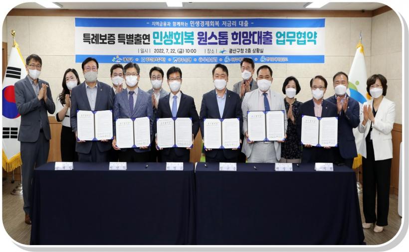 ±¤»ê±¸´Â Áö³ 22ÀÏ ¿ÀÀü ±¸Ã» 2Ãþ »óȲ½Ç¿¡¼ ±¤Áֽſ뺸ÁõÀç´Ü, ±¤ÁÖÀºÇà, ¼±¤ÁÖ»õ¸¶À»±Ý°í, ÇѸ¶À½»õ¸¶À»±Ý°í, ¿ì»ê½ÅÇù°ú ¡®2022³â ¼Ò»ó°øÀΠƯ·Êº¸Áõ ´ëÃâ ¾÷¹«Çù¾à(MOU)¡¯À» ü°áÇß´Ù.