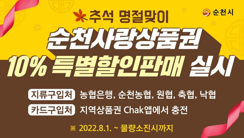 [°ø°£´º½º = ±è´ë¿µ±âÀÚ] ¼øÃµ½Ã(½ÃÀå ³ë°ü±Ô)´Â ´Ù°¡¿À´Â Ãß¼® ¸íÀýÀ» ¸Â¾Æ ¿À´Â 8¿ù 1ÀϺÎÅÍ ¼øÃµ»ç¶û»óǰ±Ç 10% Ưº°ÇÒÀÎÆÇ¸Å¸¦ ½Ç½ÃÇÑ´Ù.